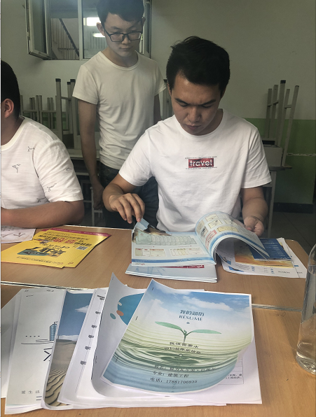 企業(yè)宣講結(jié)束后,學(xué)校給每個(gè)參加招聘會(huì)的企業(yè)安排了教室,學(xué)生根據(jù)自己的興趣意愿選擇企業(yè)進(jìn)行一對(duì)一的崗位介紹及初步面試,圖為工程建筑專業(yè)的同學(xué)閱覽我司企業(yè)簡(jiǎn)介圖冊(cè)。